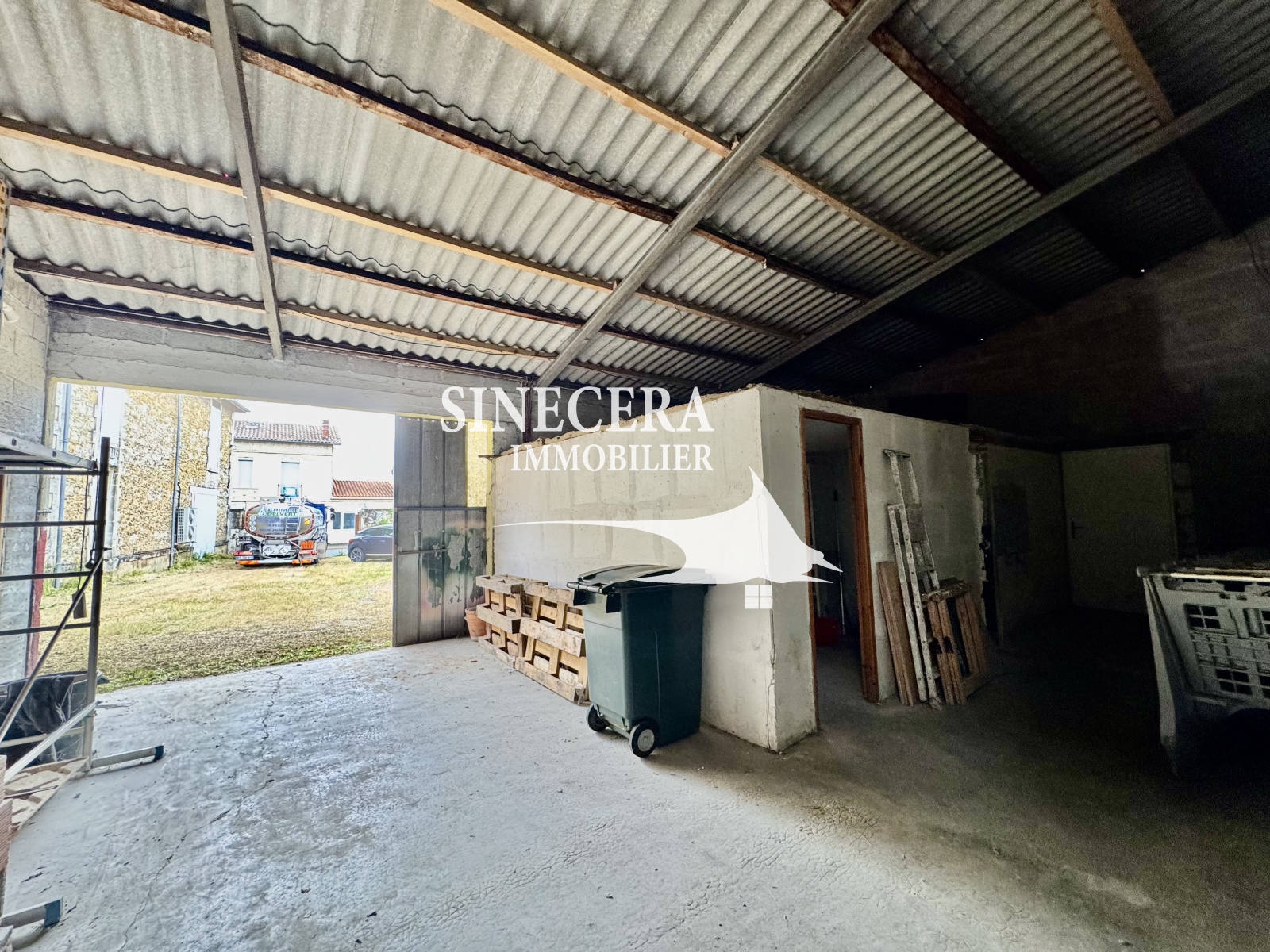 Entrepôt/garage d'environ 300m² en bon état également avec combles aménageables, des grands portails donnent sur une cour extérieure d'environ 400m², accès depuis la rue.