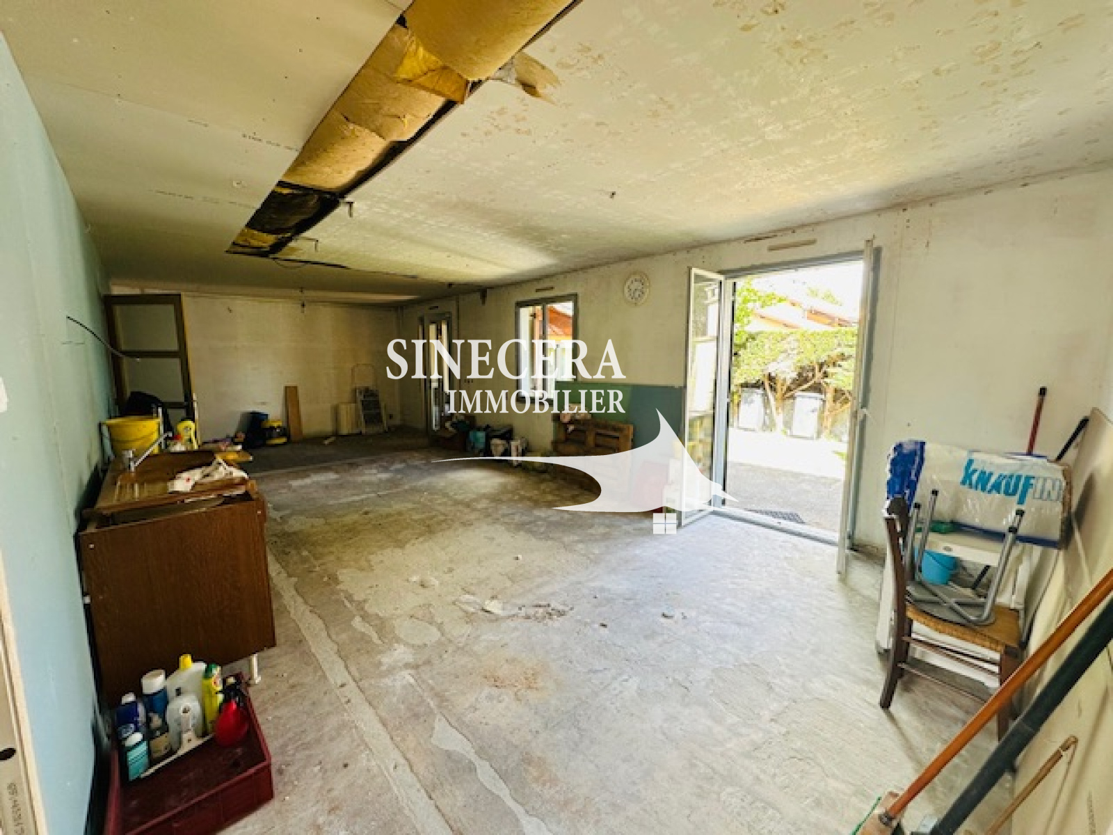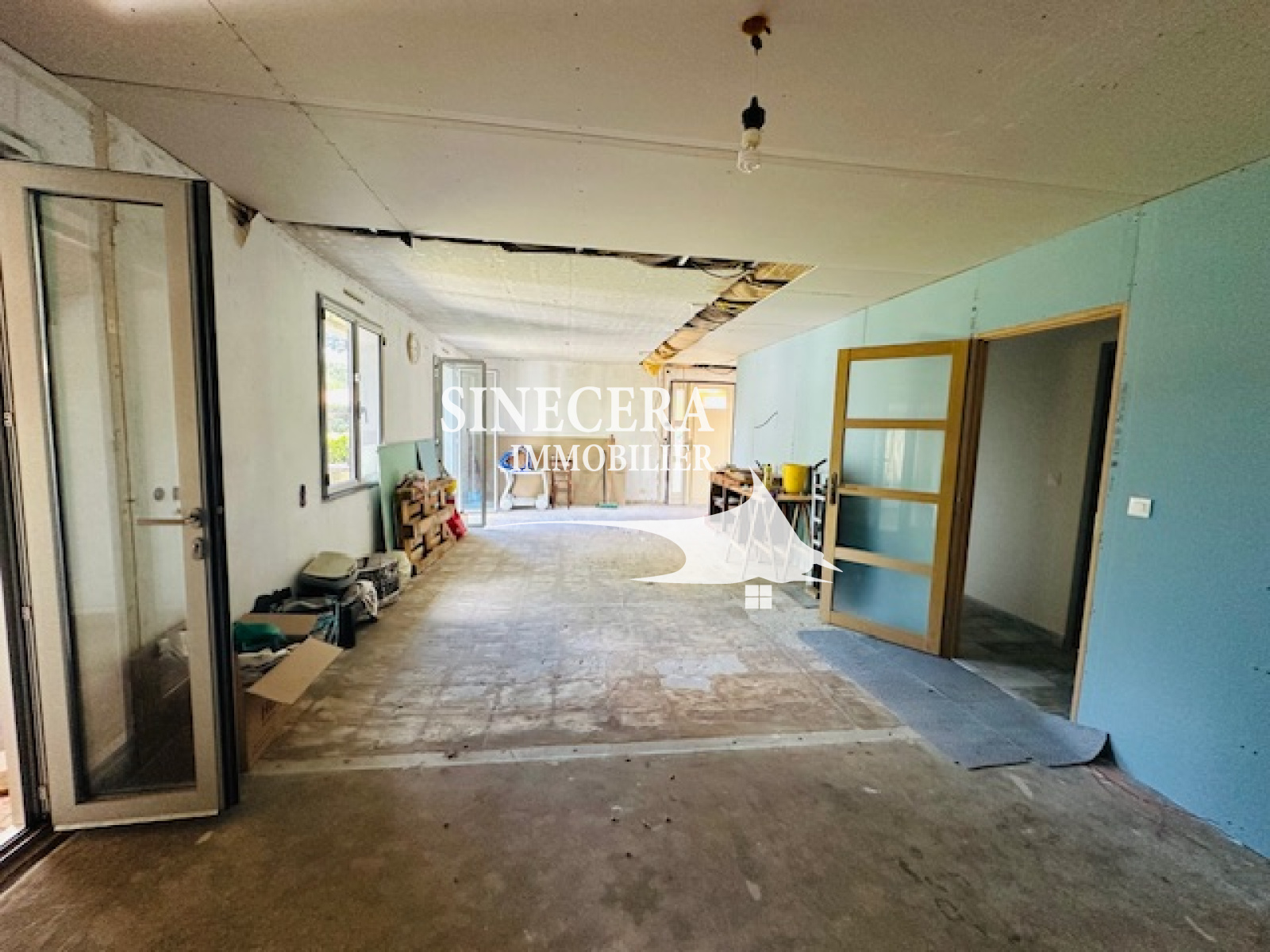 Celle-ci se compose de plein pied : D'une entrée, une pièce de vie à terminer avec emplacement cuisine prévue d'une surface de presque 40m², il ne vous reste plus qu'à laisser place à votre imagination d'aménagement.